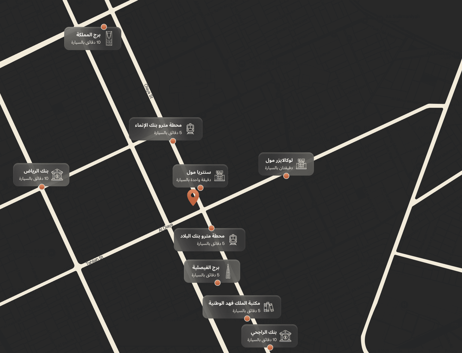 تقع أبراج العليا على مقربة من أهم وجهات الرياض التجارية والتجزئة ووسائل النقل،على بُعد دقائق من البنوك الكبرى والمراكز التجارية ومحطات المترو.